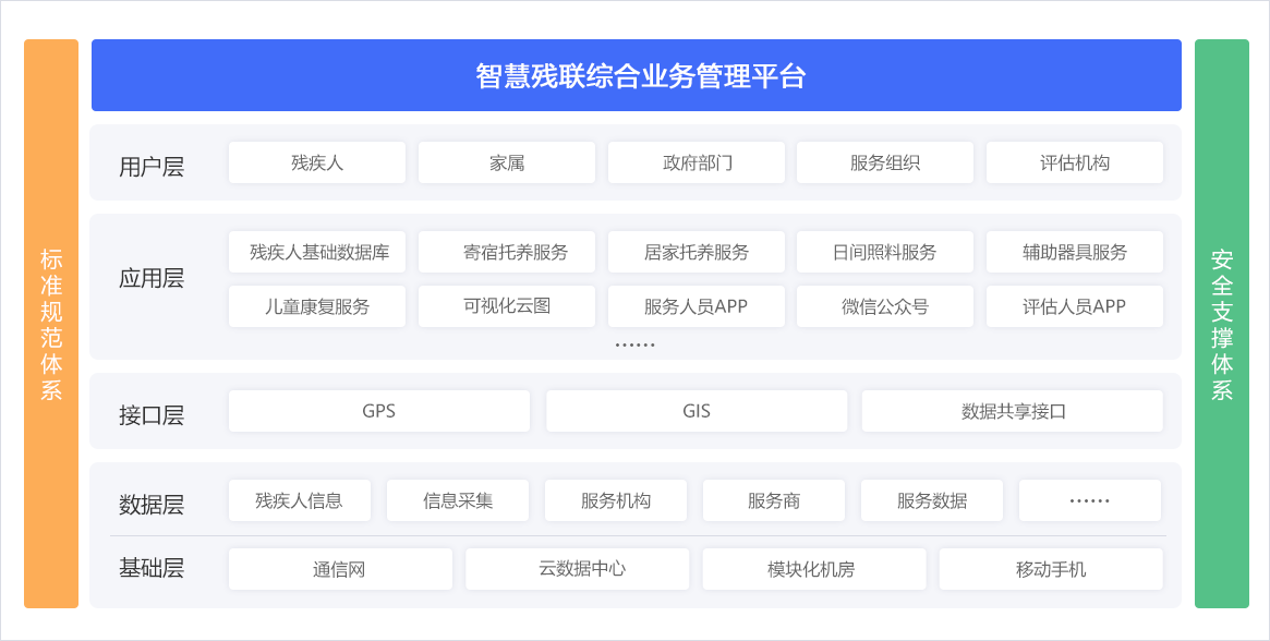 通過搭建“省-市-區(qū)(縣)-街道-社區(qū)”五級(jí)管理體系,建設(shè)殘疾人檔案、機(jī)構(gòu)、輔具、康復(fù)、就業(yè)、慈善、無障礙等方面的綜合業(yè)務(wù)管理平臺(tái),滿足主管部門的業(yè)務(wù)協(xié)同、數(shù)據(jù)交換、部門溝通等的扎口管理需求。借助“助殘服務(wù)直通車“,配套5大類助殘智能終端,提供輔具租賃、居家安防、居家探訪、兒童康復(fù)等助殘服務(wù),實(shí)現(xiàn)殘聯(lián)工作統(tǒng)籌整合、有序管理,提高基層人員工作效率,提升殘疾人幸福感。