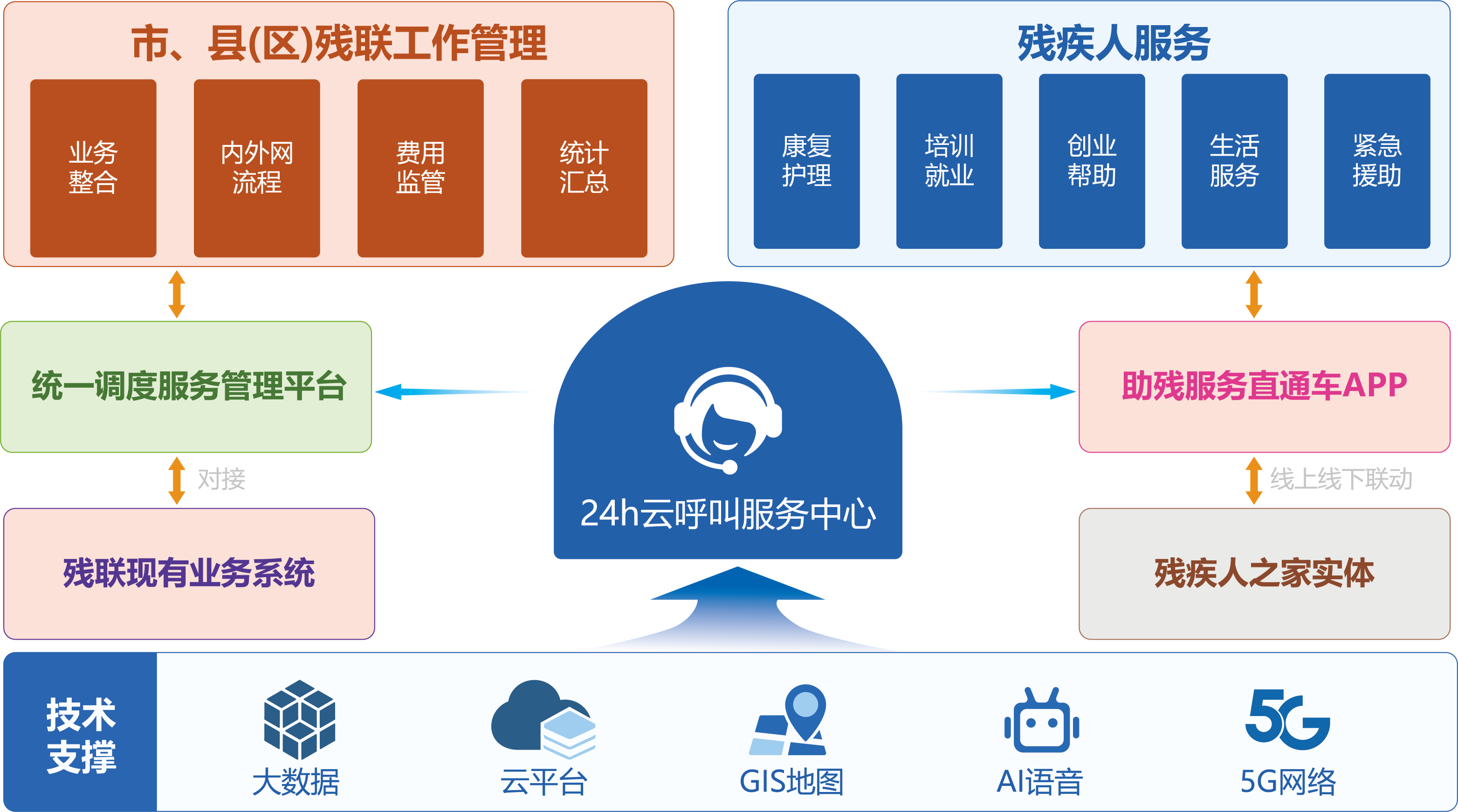藍智慧科技公司根據國家、省市政策要求,結合當前市縣(區)助殘現狀,采用互聯網+高科技手段,堅持“精細化、標準化、流程化”理念,本著為殘疾人服務為宗旨,建立智慧助殘統一調度管理平臺。平臺將殘聯的行政審批業務和面向殘疾人的精細化服務業務有機結合,進行統一的信息化管理。